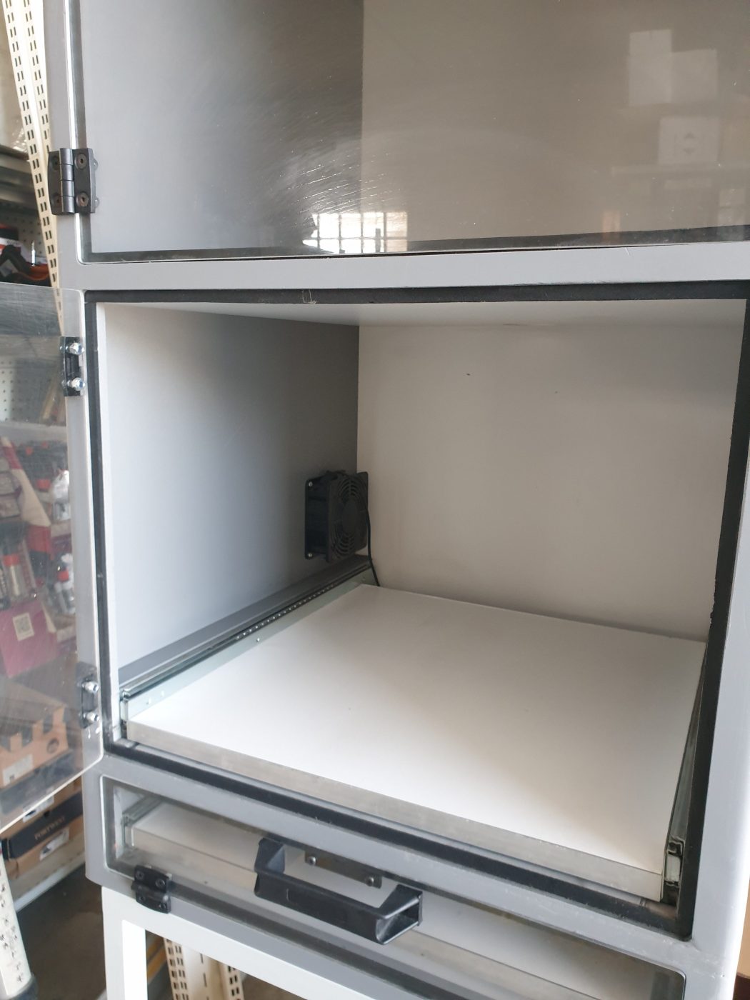 Armario de protección informática industrial, diseñado para alojar equipos como PCs, pantallas o sistemas de control en entornos de taller.