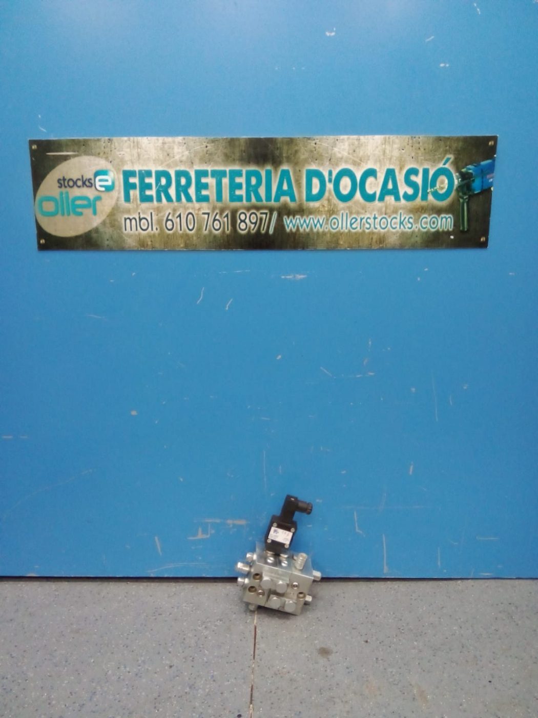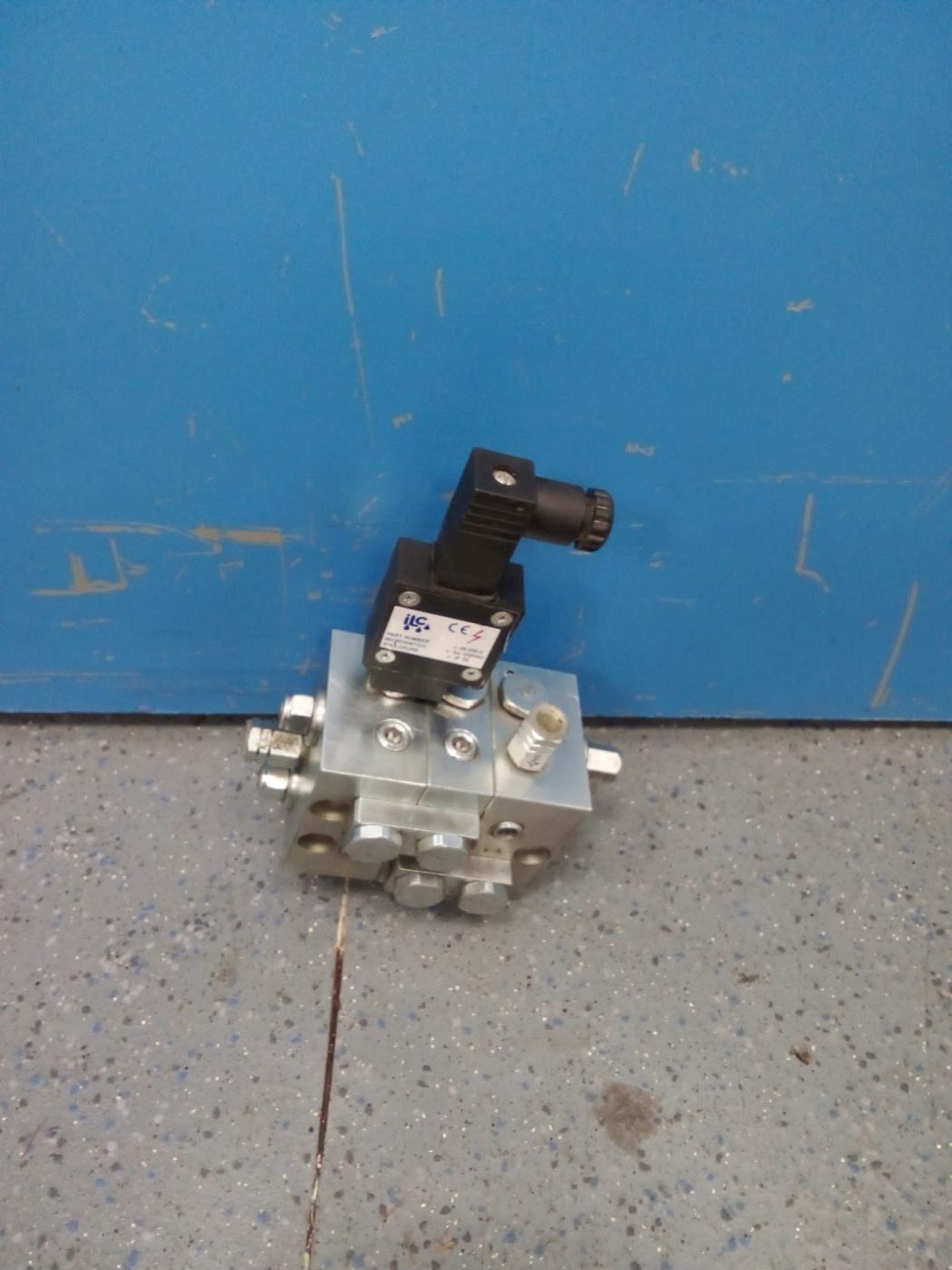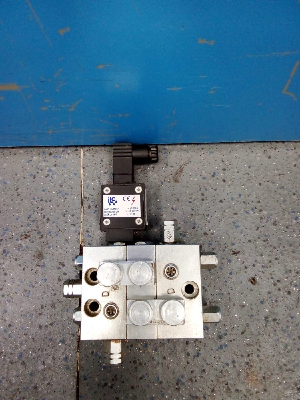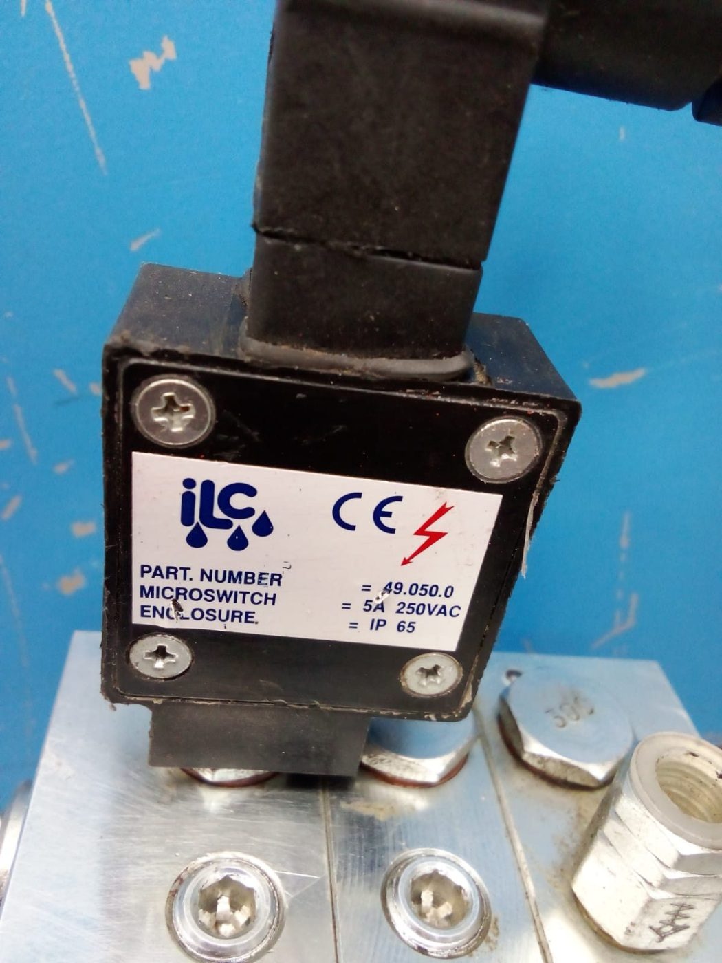Conjunto industrial formado por un bloque de válvula metálico con múltiples puertos y un microrruptor eléctrico integrado de la marca ILC, diseñado para el control y supervisión de sistemas hidráulicos o neumáticos. Este tipo de conjunto se utiliza para detectar posiciones, presiones o estados del sistema y transmitir la señal a un circuito eléctrico de control.