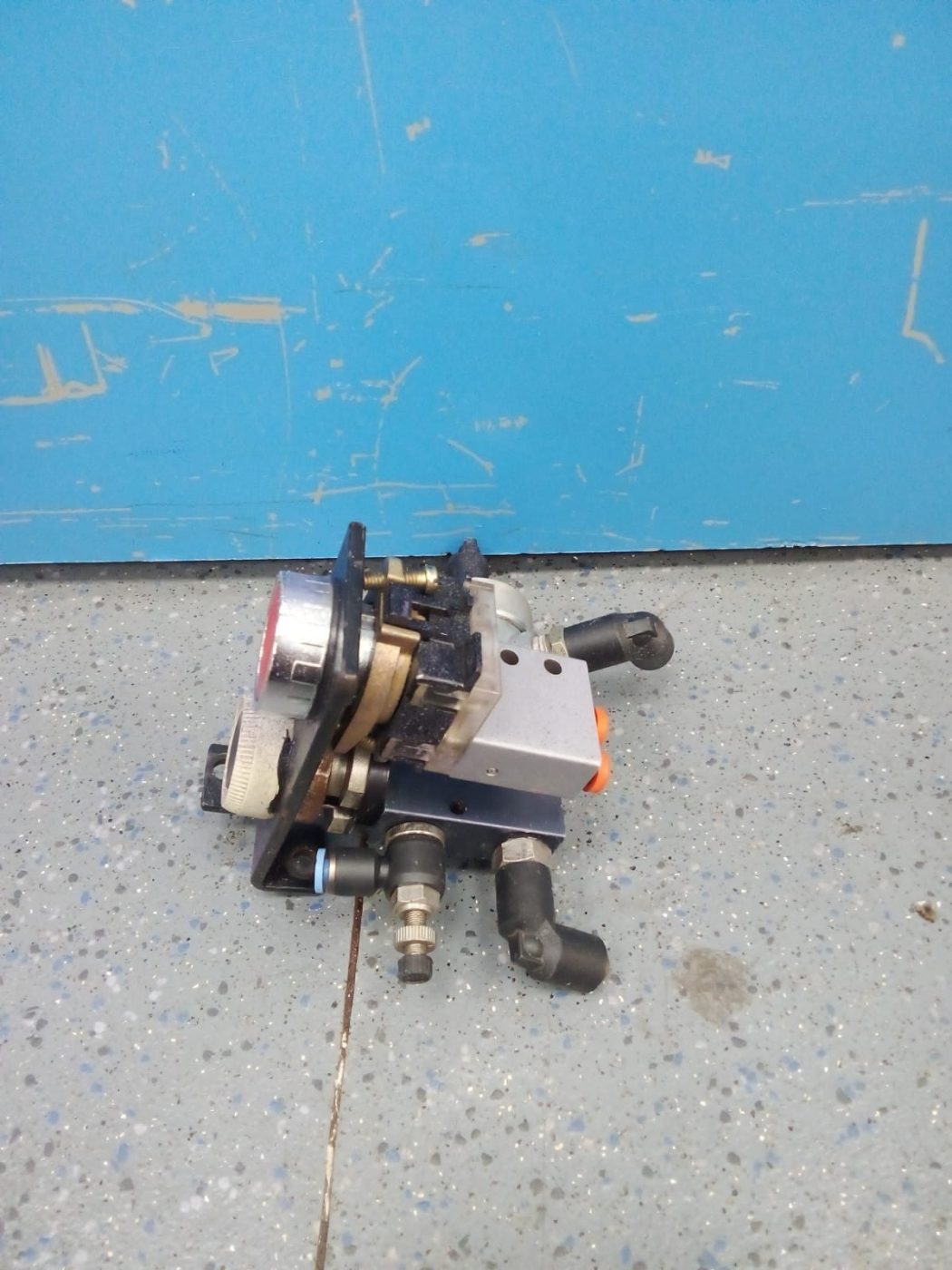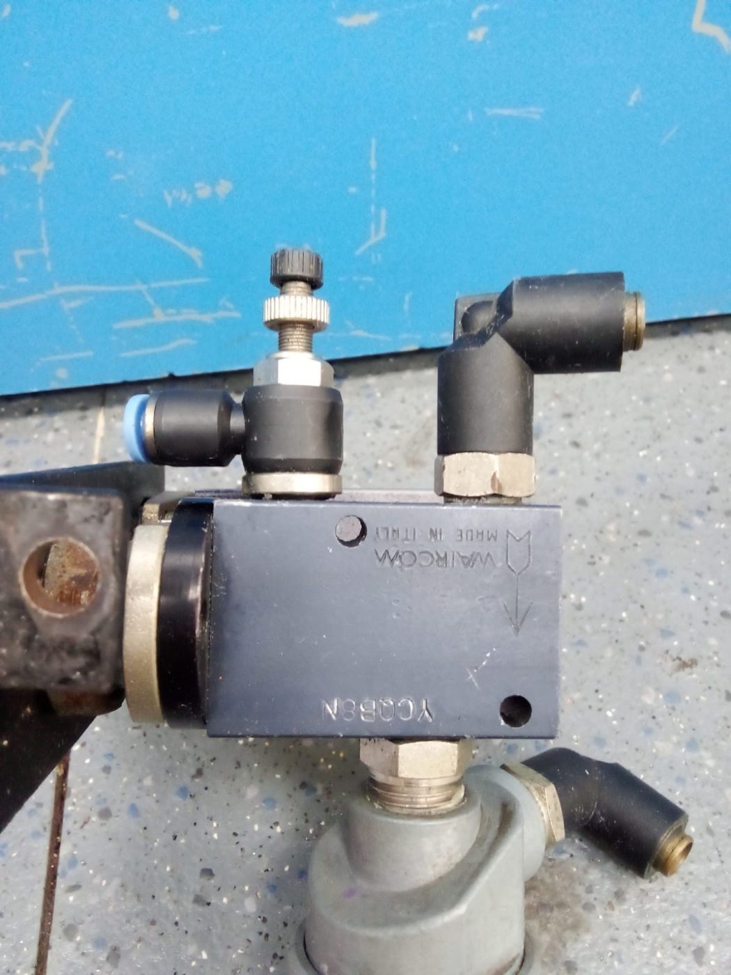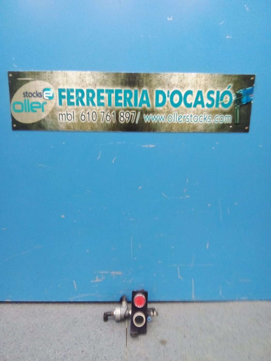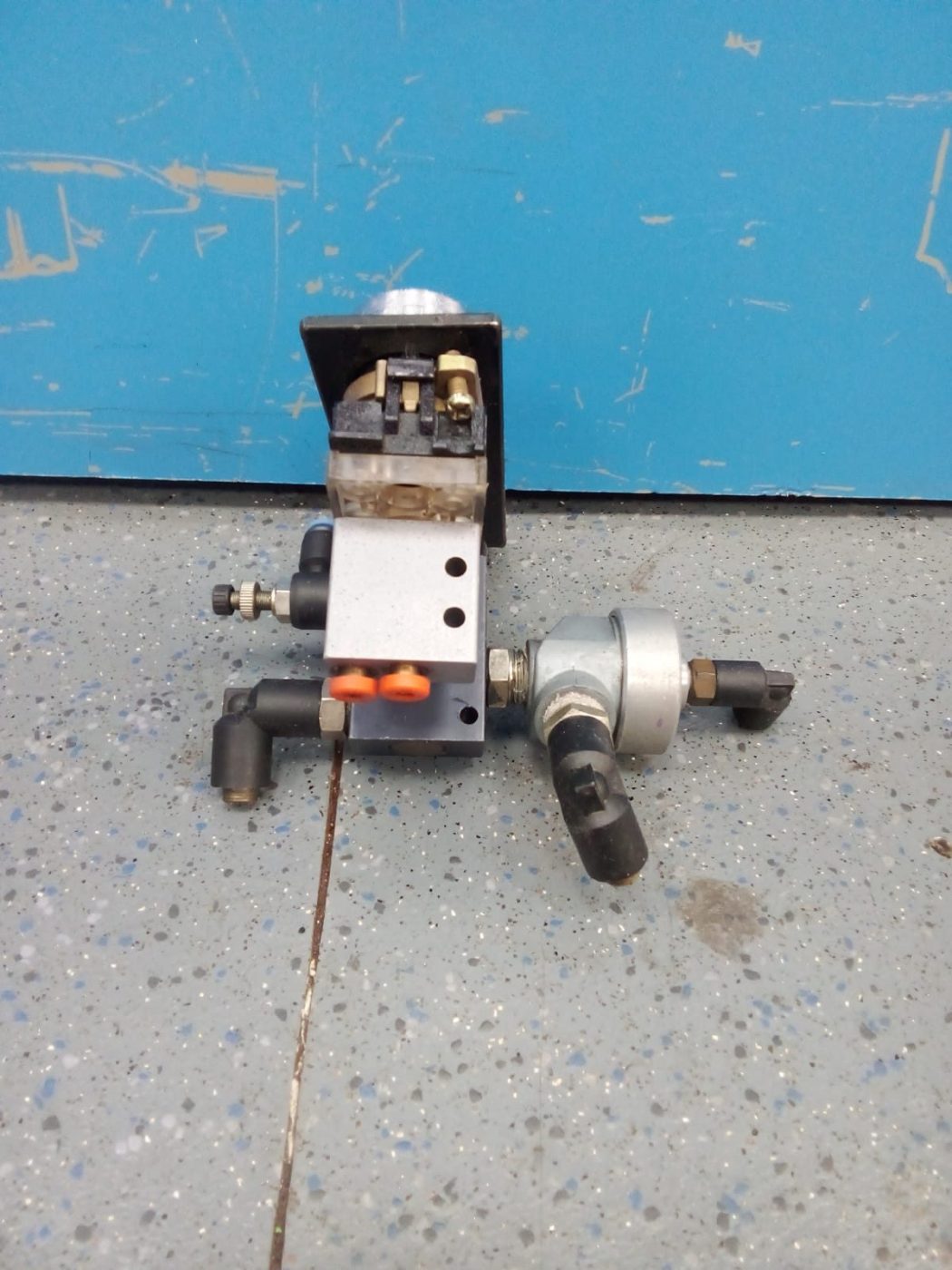 El conjunto integra un pulsador neumático de accionamiento manual, válvula interna de control, racores para conexión rápida y elementos de regulación de caudal, montados sobre soporte metálico para fijación en maquinaria o panel.