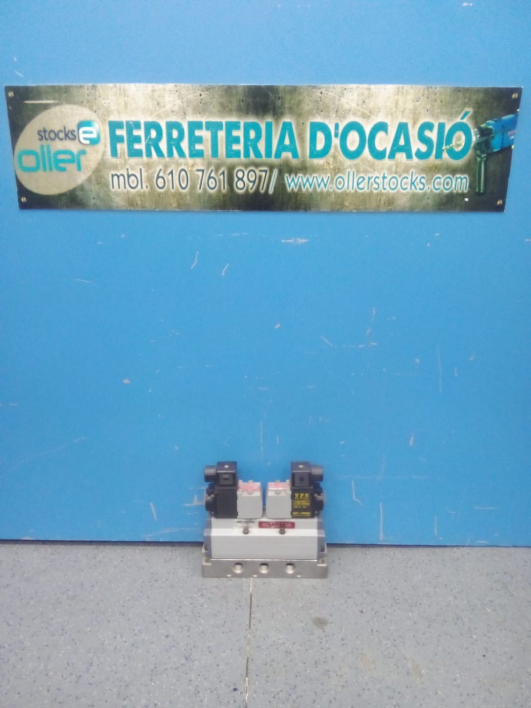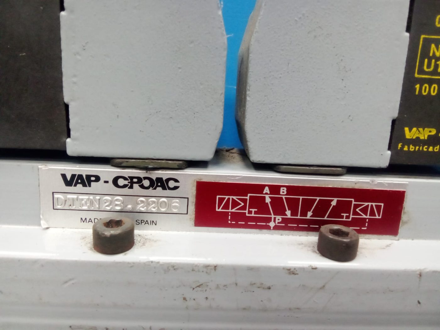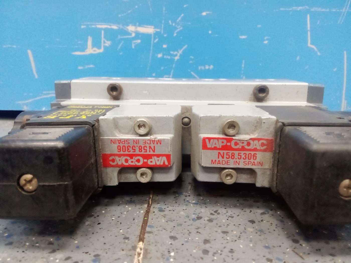 Electroválvula neumática industrial VAP-CRPAC, modelo DAWN 28.2208, diseñada para el control direccional de aire comprimido en sistemas de automatización. Configuración 5 vías / 3 posiciones (5/3) con doble bobina eléctrica, ideal para el control preciso de cilindros neumáticos de doble efecto.