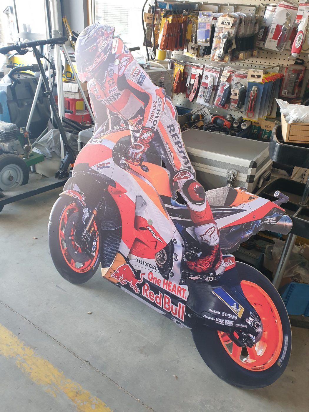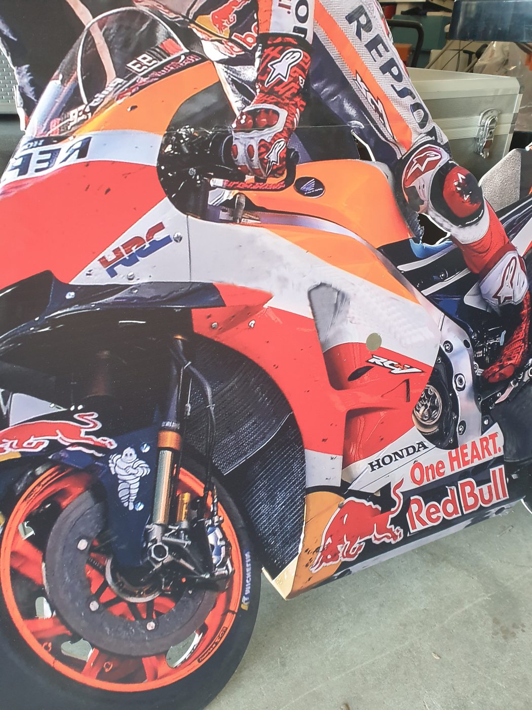 Impresionante figura tipo stand de Marc Márquez a tamaño real con los colores de Repsol Honda.