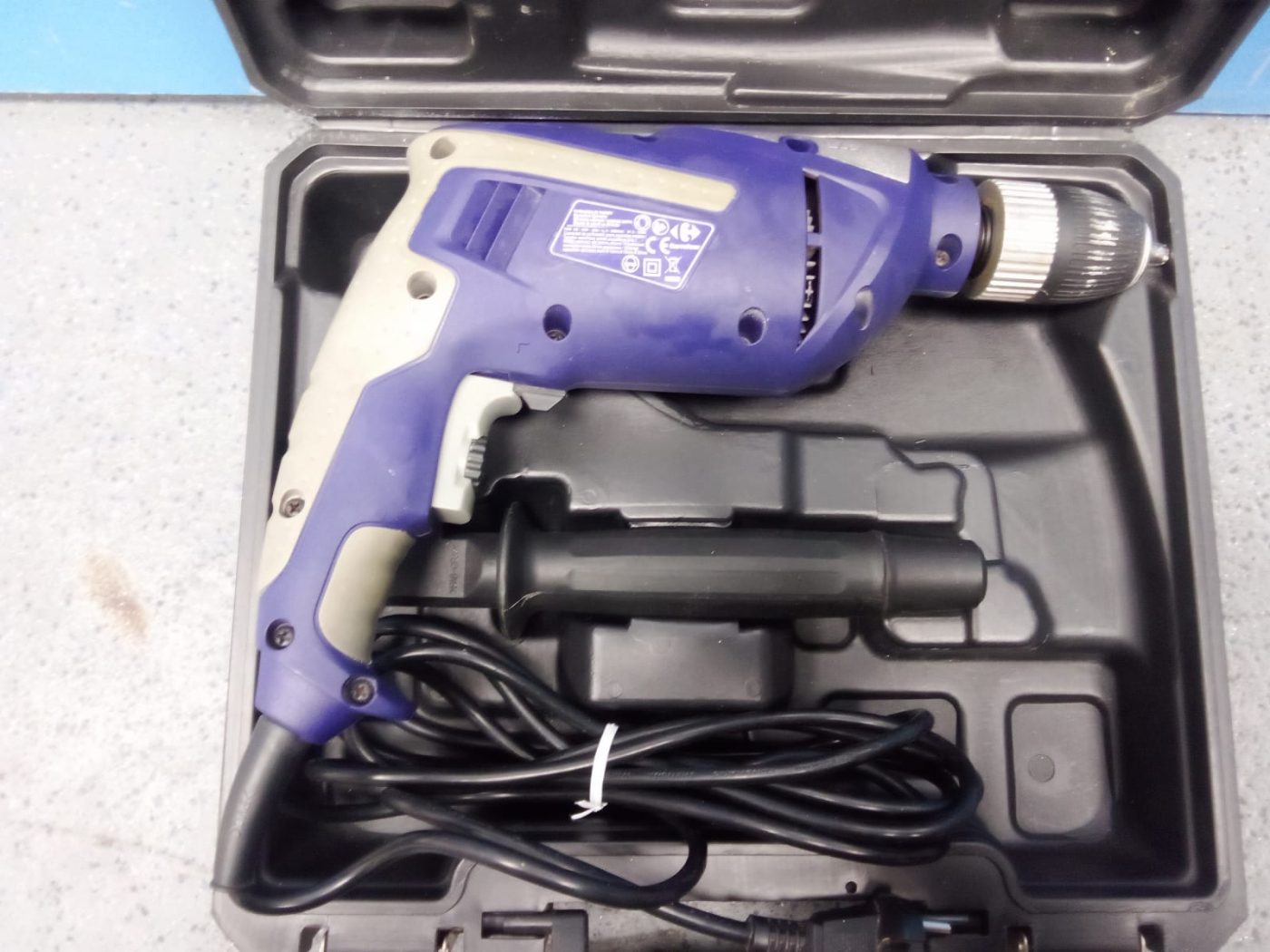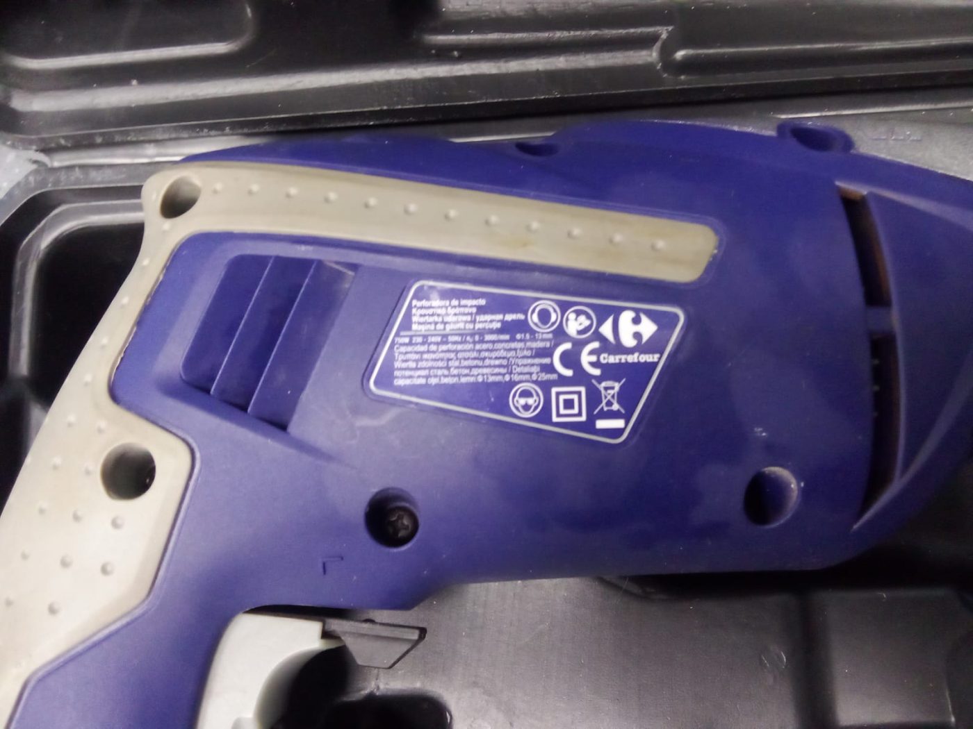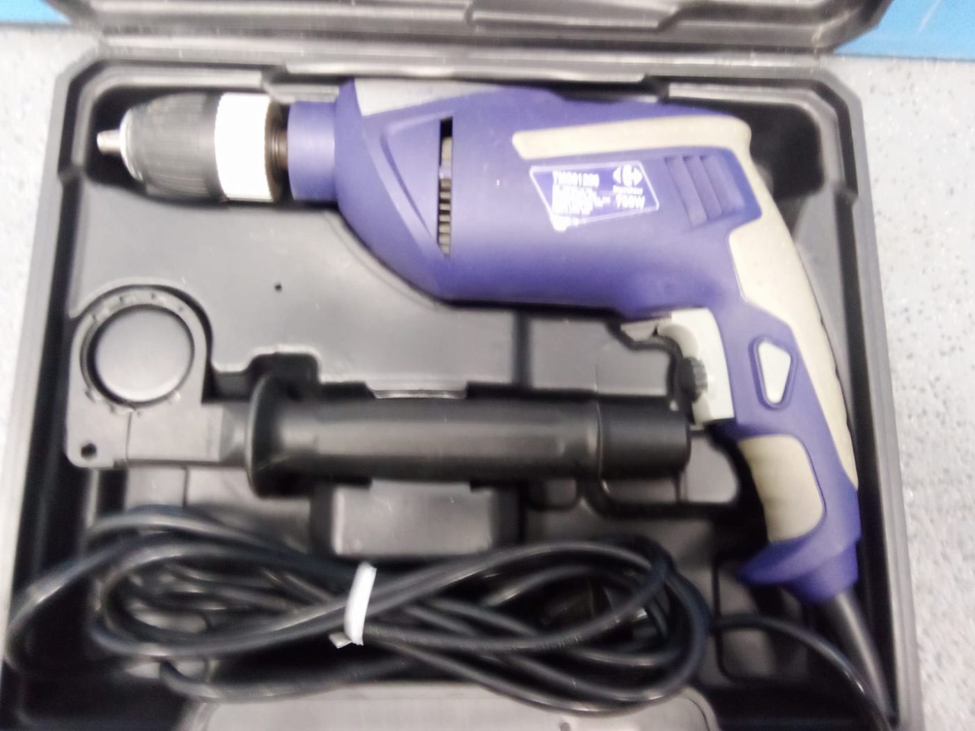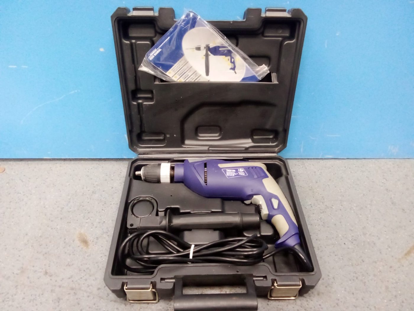 Taladro percutor de potencia 750 W, diseñado para trabajos de mampostería, hormigón, ladrillo, madera o acero. Su mecanismo de percusión permite un avance eficaz incluso en materiales duros, facilitando tanto perforaciones como atornillados ligeros.